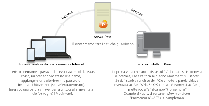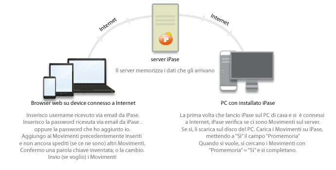 Si tratta di un caricamento dati veloce fruibile da qualunque browser, utile quando non si ha a portata di mano il proprio PC (sul lavoro, in vacanza, ecc.), ma non si vuole rinunciare ad aggiornare il proprio iPase. I dati, criptati con chiave di criptazione inserita dall'utente, vengono archiviati sul server iPase che provvederà ad aggiornare il programma una volta aperto sul vostro PC di casa (se connesso a Internet). In iPase Web non sono riprodotte tutte le funzionalità di iPase, solo quelle essenziali.